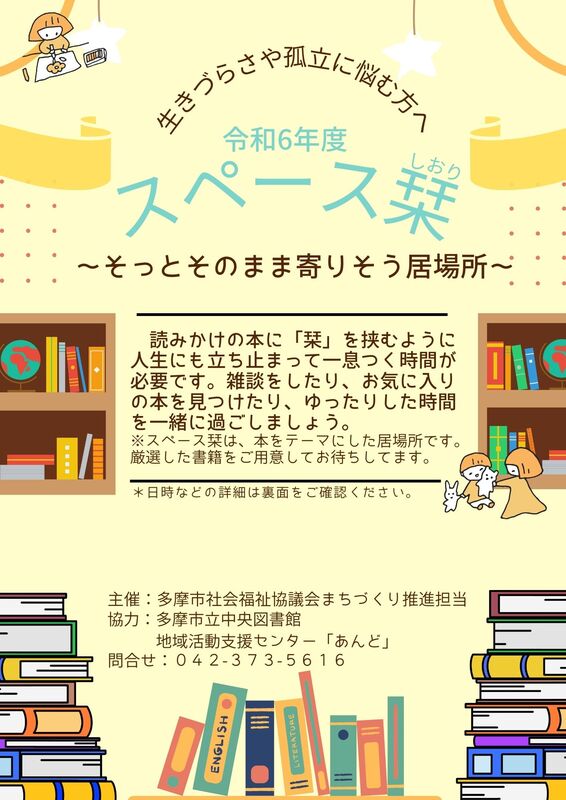 多摩市社会福祉協議会が運営する「本」をテーマとした居場所です。開催場所は2ヶ所あり、交互に開催しています。